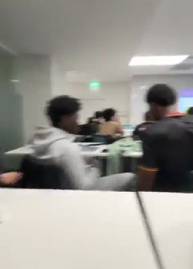 people in a classroom setting. There are students sitting at desks, some with laptops open. A projector screen is visible at the front of the room displaying information. The video is shaky and quickly pans across the room, showing different individuals. A red backpack is on a table in the foreground.