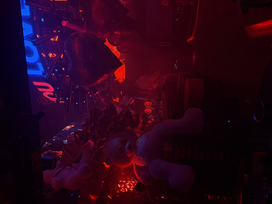 A dimly lit interior space is filled with an assortment of objects and decorations. There are plush toys, metallic balloons, and reflective surfaces. A blue "LOVE" sign is seen in the background. The scene is dominated by a dark, red hue, with some areas in near-total darkness. The composition is cluttered and chaotic, suggesting a celebratory or event-related setting.