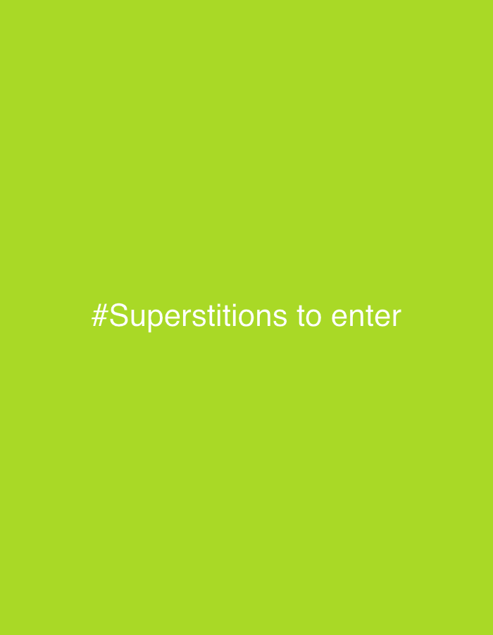 The image displays a solid lime green background. Centered on this background, white text reads: "#Superstitions to enter". No discernible location within Tel Aviv, specific environment, people, subjects, objects, actions, or interactions are depicted in the image.