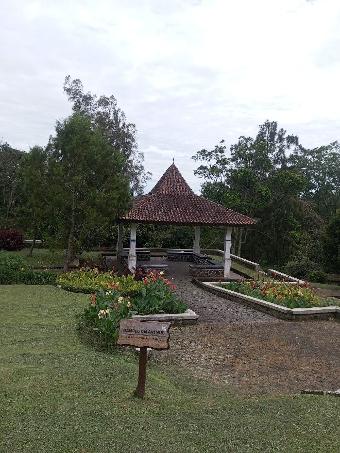 A gazebo with a dark-tiled roof stands in a park-like setting, surrounded by trees and greenery. The structure has white pillars and is accessible by a stone path. Flower beds with red and yellow blooms line the path. A sign reading "DANDELION AVENUE" is in the foreground, set on a grassy lawn. The sky is overcast, creating a soft, diffused light across the scene.