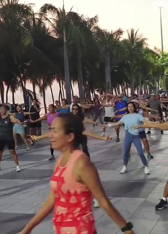 - "A large group of people of various ages exercise outdoors on a paved area lined with tall palm trees" by FM-O9tY22, licensed under CC BY 4.0