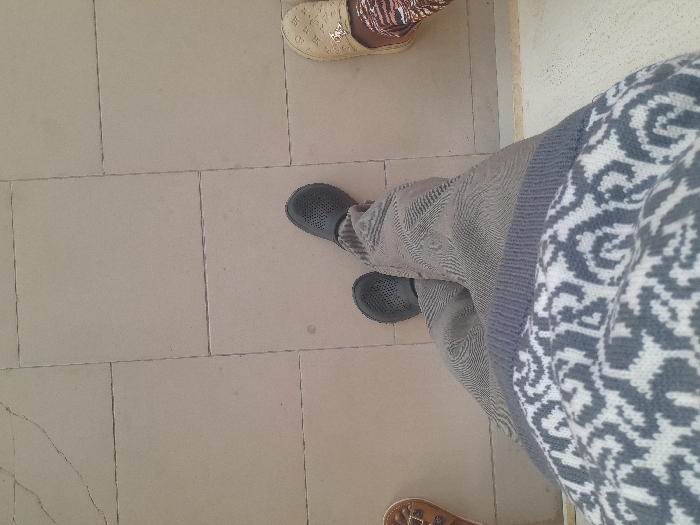 A high-angle forensic view captures the lower extremities of three individuals standing on a light-colored tiled floor in Dabawa, Nigeria. The floor consists of rectangular tiles with visible grout lines; minor cracks are present in the upper left section of the tiling. The central figure wears a grey and white patterned knit garment over grey, possibly textured, trousers, and dark grey perforated slip-on shoes. To the right, a person's right foot is visible, wearing a light beige patterned slip-on shoe and a brown and white patterned fabric on the lower leg. To the far left, a person's left foot is partially visible, clad in a brown open-toed sandal with strap detailing. No direct interactions or specific actions are discernible beyond standing.