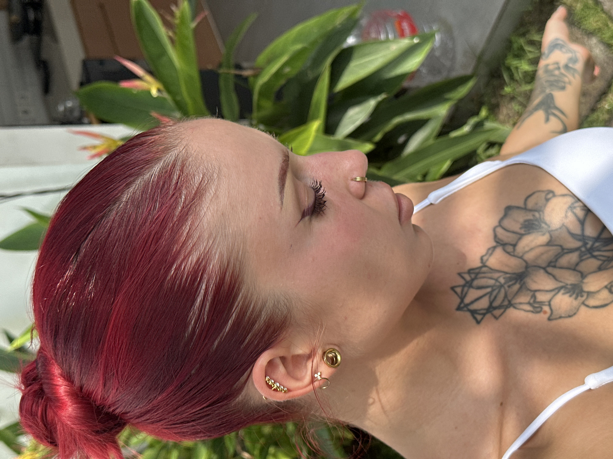 A female subject, viewed from the upper torso, is depicted in an outdoor setting in Kerobokan, Indonesia. Her head is angled downwards and to the right, showcasing bright red hair pulled into a bun, with visible lighter roots. The subject's left ear is adorned with multiple gold-colored piercings, including a decorative cluster on the upper cartilage, a small hoop with a three-leaf design, and a large circular earlobe tunnel. A triple gold-colored ring piercing is present on her left nostril. Her left eye displays winged eyeliner and dark, elongated eyelashes. Tattoos include a prominent black-ink floral and geometric design on her upper left chest and additional black-ink patterns on her left arm. She is wearing a white top with spaghetti straps. The background features out-of-focus, sunlit tropical foliage, specifically Strelitzia (Bird of Paradise) plants with red-orange and yellow bracts. A partial view of a light-colored structure and a clear plastic water bottle with a red cap are visible in the background, while the lower right shows a paved ground surface with small green plant growth.