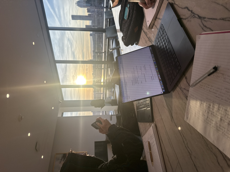 The image portrays an interior scene within a high-rise building in Boston, United States, during sunset. The vantage point overlooks the city skyline, featuring the distinct Millennium Tower prominently on the right, indicating a general westward or southwestward view. In the foreground, a light-colored, marble-patterned countertop displays multiple items: a white spiral-bound notebook with handwritten text and a wooden pen on the left; a dark gray laptop (MacBook Pro-style) centrally placed, open to a document with text and mathematical formulas; and a second, partially visible dark-colored laptop behind it. To the right, a black quilted bag rests beside a spiral-bound notebook where a person's hand is observed writing with a pen. A person, partially visible on the far left, is wearing a dark hooded garment and operating a smartphone held with both hands. The background is dominated by expansive floor-to-ceiling windows, through which a vibrant sunset casts a strong glare and lens flare, illuminating the interior. The sky exhibits warm orange and yellow tones with scattered clouds. The distant Boston skyline includes numerous buildings. The interior space features recessed ceiling lighting, visible dark furniture, and a wall-mounted artwork.