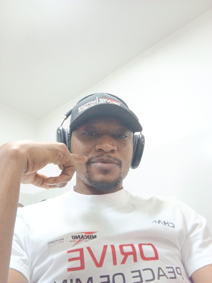 An upward-angled, eye-level selfie-style photograph depicts a dark-skinned adult male centered in the frame. He wears a black baseball cap with "MIKANO MOTORS DIVISION" and a logo visible in reversed text, along with black over-ear headphones. His eyes are directed at the camera. He has a short beard and mustache. His right hand is raised, with his index finger touching the skin directly below his lower lip, and his thumb extended along his jawline. He is wearing a white crew-neck t-shirt which also displays reversed text: "MIKANO" and "DRIVE PEACE OF MIND" in red font, with "CHAMP" visible on the upper right side of the shirt. The background is a plain, brightly lit white wall or ceiling. Based on the visible branding, the individual is likely situated within a Mikano Motors facility, such as a showroom or office, in the city of Abuja, Nigeria.