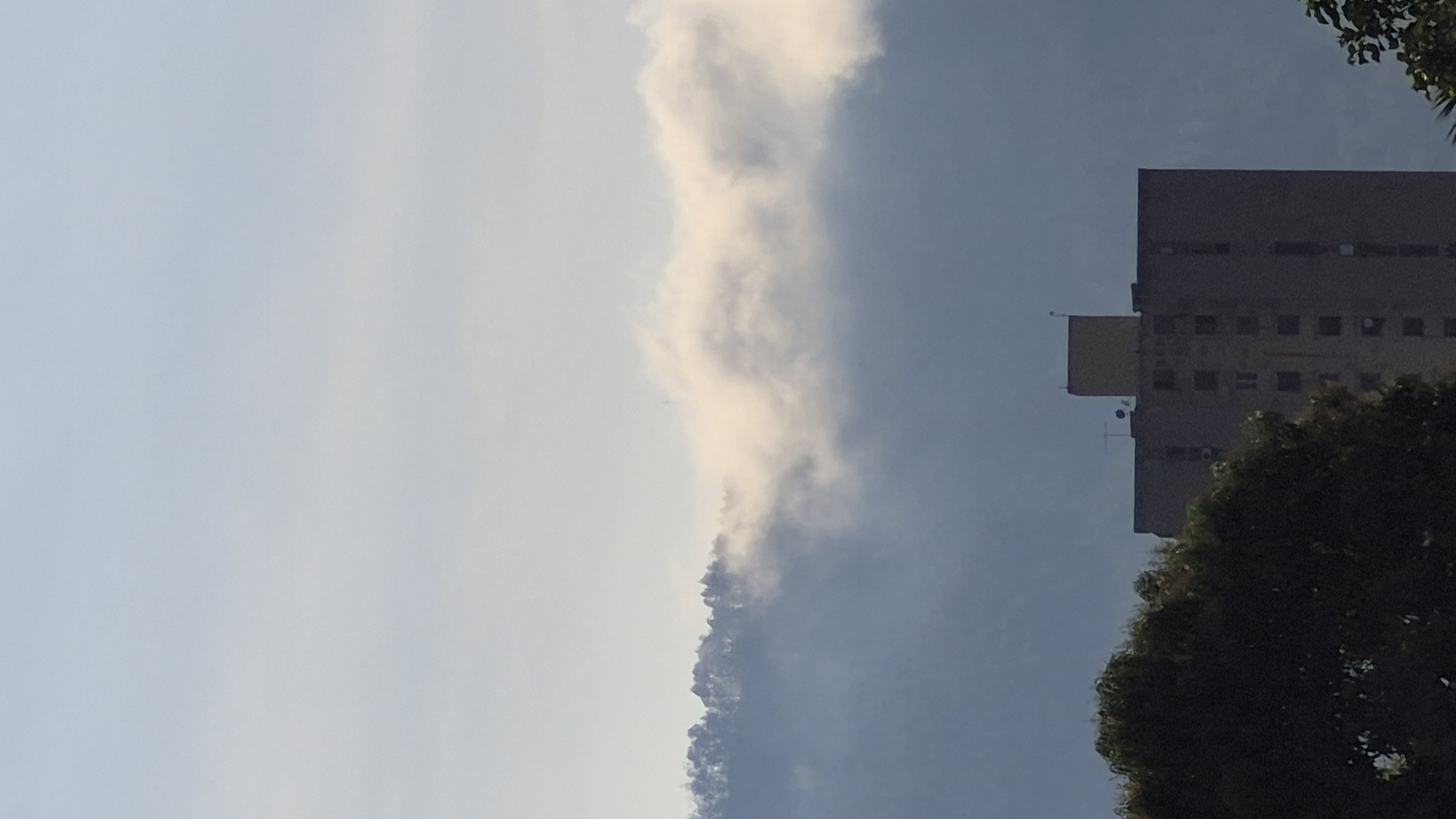 The image depicts a multi-story building and a mountain range partially covered by clouds, under a light blue sky in Valencia, Venezuela. A tall, rectangular building with a dark grey facade and numerous rectangular windows occupies the lower-mid portion of the frame. A smaller, yellowish-brown structure with antenna-like elements is visible on its roof. Dark green foliage from trees or bushes partially obstructs the lower corners of the image. Behind the building, a distant, dark blue mountain range is visible, its upper slopes and tree-covered peaks piercing through a prominent horizontal band of white, dense clouds or fog that obscures the lower and mid-sections of the mountains. The sky above the mountains is a uniform light blue with minimal cloud cover. No individuals or specific actions are discernible.
