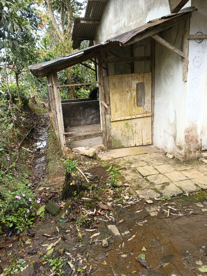 The scene depicts a weathered exterior of a structure in the City of Unknown, Vietnam. A single-story building with light-colored, discolored concrete or stucco walls exhibits red staining and green algal growth. Attached to this building is a lean-to porch featuring a rusty, corrugated metal roof supported by rough-hewn wooden beams. Beneath the lean-to, a faded yellow wooden door with peeling paint and a central vertical rectangular cut-out provides access. Faint, circular graphic symbols, including a "no smoking" sign and a 'smiley face' with 'X' eyes, are visible on the main wall above the door. An open concrete enclosure, containing a dark, indistinct object, is situated to the left of the door, also under the lean-to. The ground directly in front of the structure is paved with wet, moss-covered square flagstones, which transition to a darker, similarly wet paved area to the right. To the left of the lean-to, a narrow, muddy water channel flows, bordered by dense, unkempt vegetation including small pink-flowered plants. A dark tree stump with new growth is prominent in the foreground. The background is dominated by lush, green trees and dense foliage. No individuals or active subjects are present.