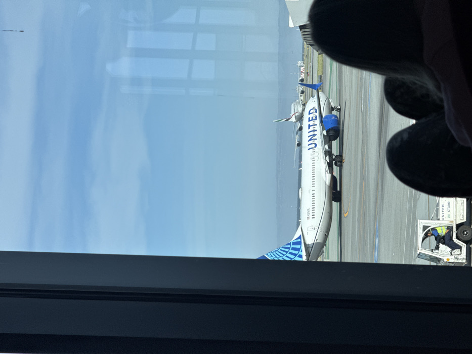 The image depicts an airport tarmac scene viewed through a large window from inside a terminal at San Francisco International Airport (SFO), San Francisco, United States of America
