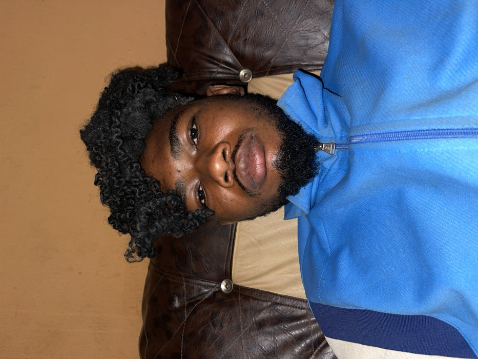 A male individual, appearing to be of African descent, is depicted in a close-up portrait, seated indoors in Unguwar Gabas, Nigeria. He has dark skin, dark eyes directly facing the camera, a trimmed dark beard forming a goatee, and prominent lips. His black, curly hair is styled with volume on top, extending towards the left side of his forehead. He is wearing a bright blue zippered track jacket, which features a silver-colored zipper pull and partially visible dark blue and off-white stripes on the left shoulder and arm. The subject is seated on a dark brown tufted leather or faux leather sofa, identifiable by a metallic button detail on the backrest visible to the viewer's left. The background consists of a plain, light brown wall.