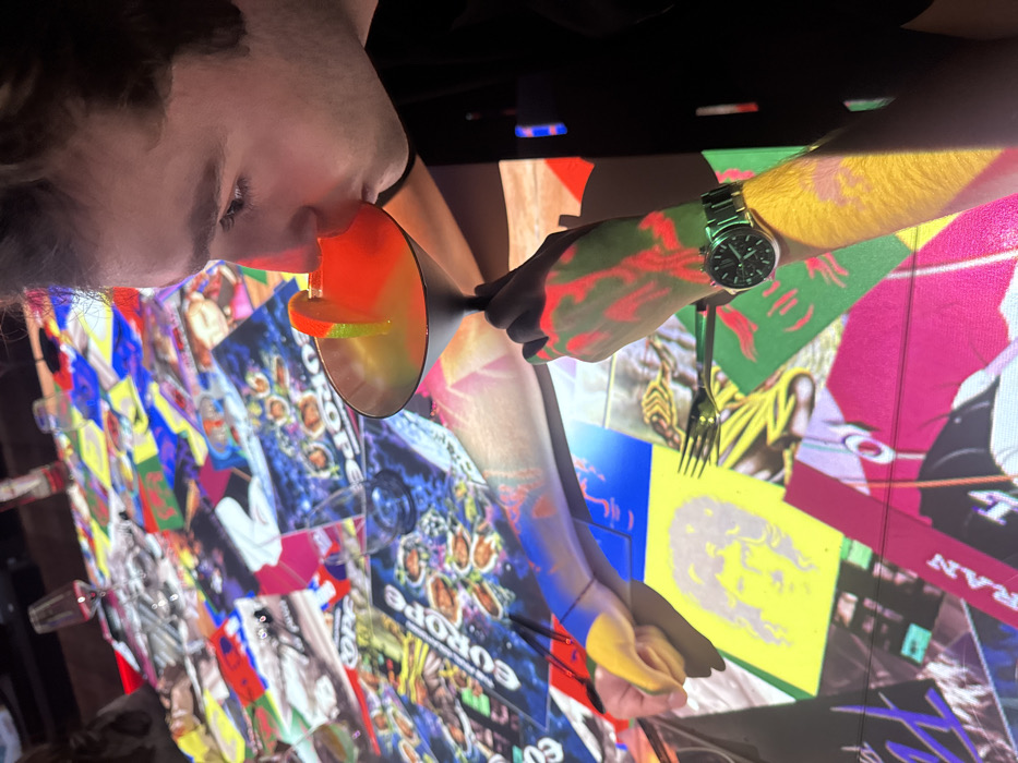A male individual is depicted in a dimly lit indoor setting, actively drinking from a cocktail glass. He is positioned in profile, facing left, with his right hand holding a silver-rimmed martini glass containing a yellow-orange liquid garnished with a lime wedge. The glass is held close to his mouth. His left arm rests on a large, rectangular table. He wears a dark short-sleeved top and a metallic wristwatch with a dark face on his left wrist. The table surface functions as a projection screen, displaying a mosaic of colorful, pop-art style images. These images include album covers, such as "Europe," stylized faces (one in yellow and grey), abstract patterns, and text fragments. The projected light from the table casts vibrant colors onto the man's arms and hands; his left arm shows blue and yellow hues, while his right hand and wrist exhibit red and orange patterns. Other objects on the table include several empty clear drinking glasses and a silver fork. The scene takes place at De Kazerne, located at Paradijslaan 2-8, 5611 KN Eindhoven, Netherlands, a venue known for its interactive table projection experiences.