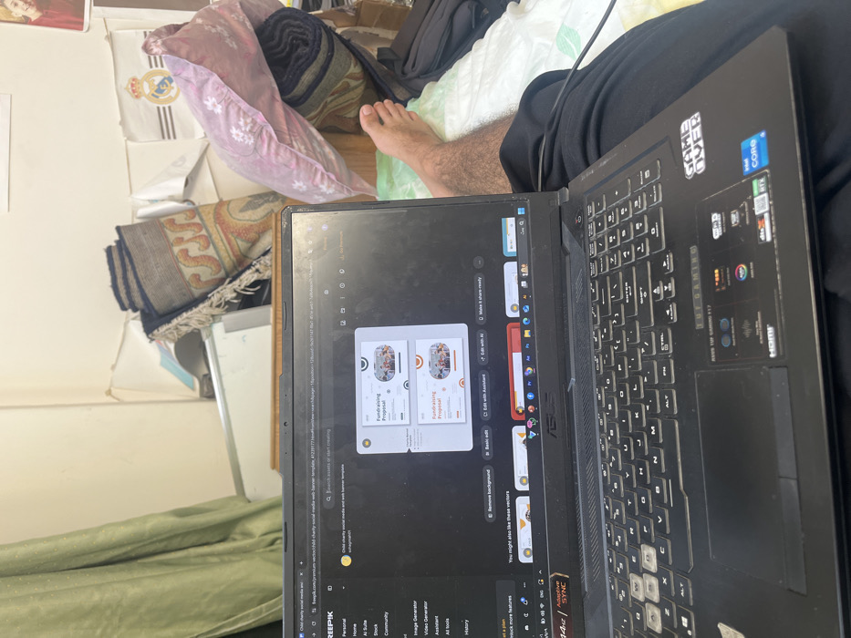 An indoor scene in a domestic setting, located within Rukn ad-Din Municipality, Syria. The image focuses on a black ASUS TUF Gaming F17 laptop, open and displaying a website (Freepik.com) with "Child charity social media and web banner template" visible on its screen, showcasing two "Fundraising Proposal" designs. The laptop rests on the lap of an individual, whose lower right leg and bare foot, covered in dark hair, are visible to the right of the laptop. The leg is resting on a light-colored sheet with a subtle green pattern, likely covering a bed or mattress. The individual is wearing dark clothing on their lap. A black cable extends from the right side of the laptop. In the background, a light-colored wall is visible. To the far left, a light green curtain hangs. Moving right, a rectangular, light-colored object, possibly an appliance, is partially visible. Further right, two rolled-up, patterned rugs are stacked against the wall, with a light pink, possibly floral-patterned, pillow leaning next to them. Above these items, a white sheet or flag bearing the Real Madrid football club logo is affixed to the wall. To the far right, a portion of a poster or photograph depicting a female face is visible on the wall. The overall environment appears lived-in.