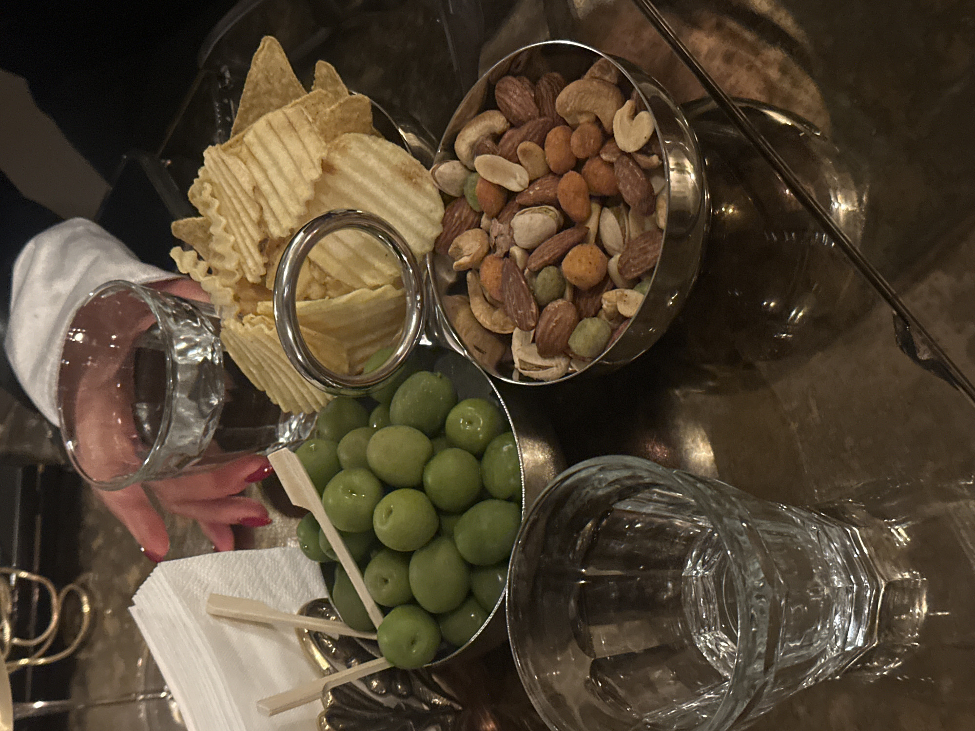A top-down, slightly angled shot shows a metal divided serving dish containing chips, nuts, and green olives, on a reflective surface alongside two empty glasses, one partially obscured by a hand holding a napkin
