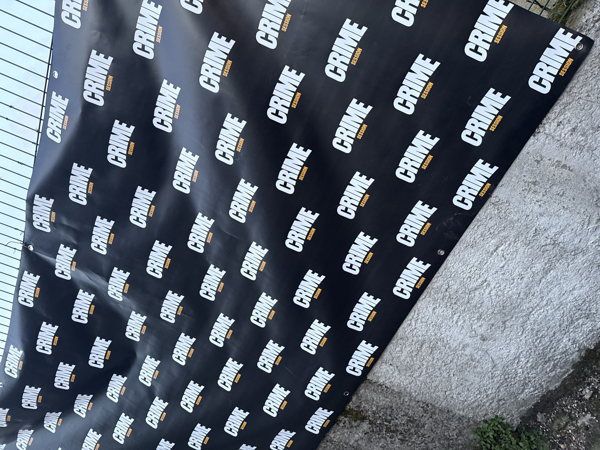 In Noisy-le-Sec, France, a large, black vinyl banner is vertically displayed outdoors. The banner features a repeating pattern of "CRIME" in prominent white, bold, italicized lettering, with "SESSION" in smaller orange text directly below each instance of "CRIME". Metal grommets along the upper edge of the banner secure it to a light-colored, grid-patterned metallic fence, which is visible against a bright, uniform sky. The banner exhibits minor creases. Below the banner, a textured, rough grey concrete surface is visible, along with small patches of green vegetation growing from the ground in the lower left quadrant. No individuals or active subjects are present.