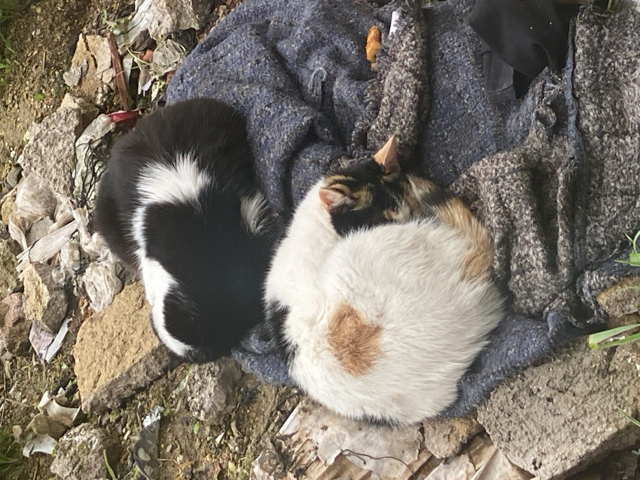 - "This image displays two domestic cats resting on a dark blue/grey woven blanket amidst an accumulation of debris" by FM-ZyJNa2, licensed under CC BY 4.0
