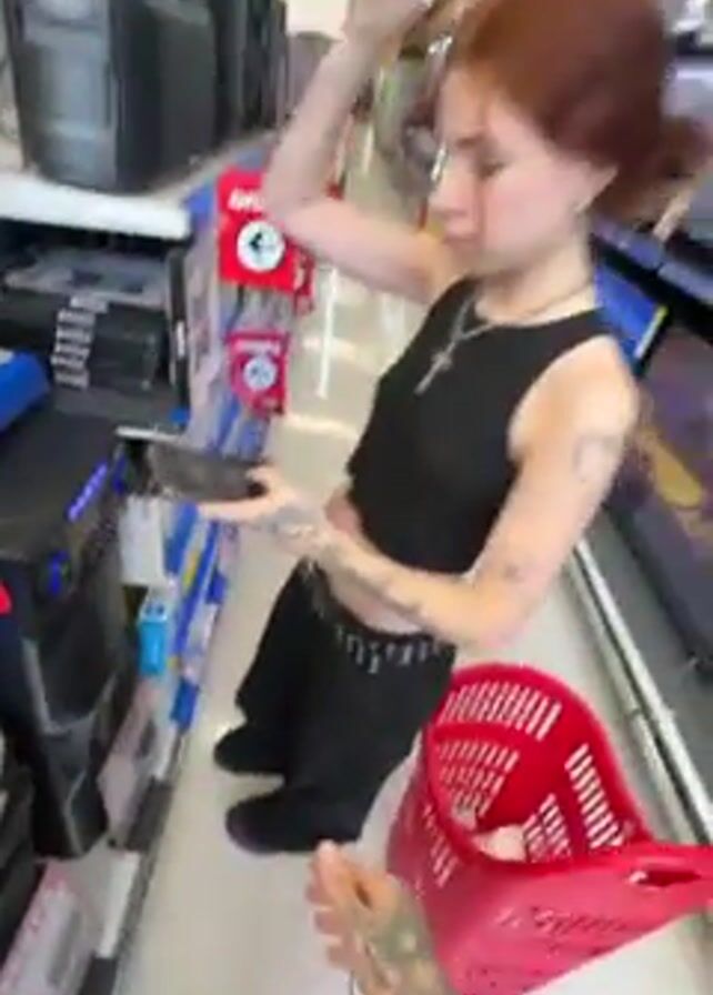 A tattooed person holding a red shopping basket films a young woman with red hair and tattoos standing in an electronics aisle of a store