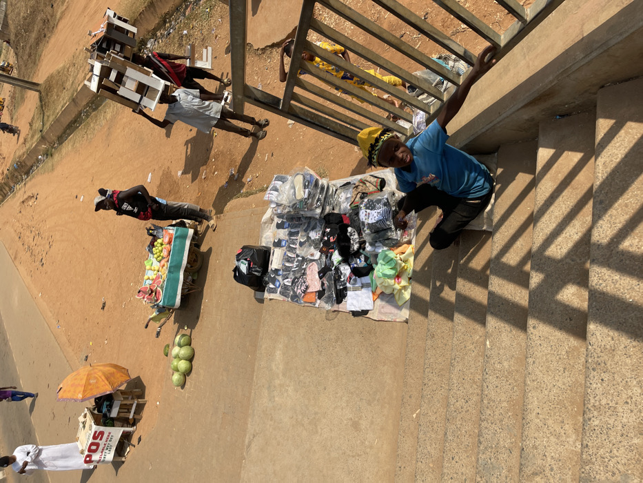 The image depicts an active outdoor market scene in Kuchingoro, Nigeria, captured from an elevated perspective looking down a concrete staircase onto a mixed-surface area of dirt and pavement under direct sunlight. In the immediate foreground, a young individual wearing a blue t-shirt, black trousers, and a yellow and black patterned head covering is seated on the concrete steps, leaning against a dark metal railing on the right, looking towards the camera. Distinct parallel shadows from the railing are cast across the stairs. Adjacent to the stairs, a white ground cloth displays various merchandise, including packaged socks and clothing items, alongside a black plastic bag. In the midground, an unpaved area features a vendor's wooden pushcart laden with an assortment of fruits, including sliced watermelons, whole watermelons, and apples. A cluster of whole green watermelons rests on the ground next to the cart. A male figure, dressed in dark clothing and a cap, stands near this fruit cart, with an object secured on his back, possibly a child in a carrier. To the left, a small wooden stand labeled "POS" (Point of Sale) with a sign indicating "AVAILABLE HERE DON'T LET THEM TAKE IT" is present, shaded by an open orange umbrella. A person in a long white robe stands near the POS stall. Another individual in a purple shirt is visible walking away further down a dirt path. The background reveals a wider reddish-brown dirt road, bordered by a concrete drainage channel. Two male figures are walking along this road: one in a light-colored shirt is carrying a large, stacked arrangement of white, rectangular structures on his head, followed by another man in a red shirt. A third individual wearing yellow patterned clothing is partially visible near a metal railing on the far right.