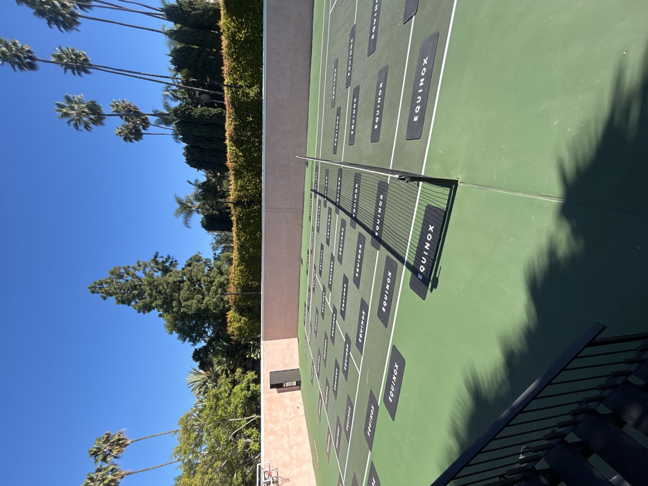 The image displays an outdoor, green-surfaced court, likely a re-purposed tennis court, situated at a fitness facility in Beverly Hills, United States