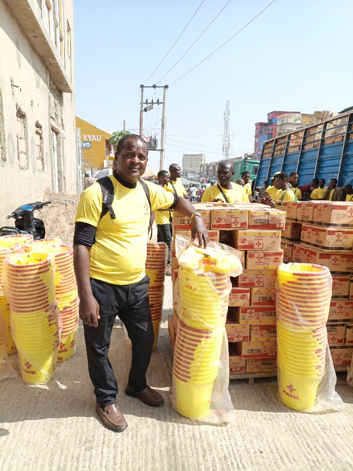 An outdoor scene in Fagge C, Nigeria, depicts a distribution or merchandising operation