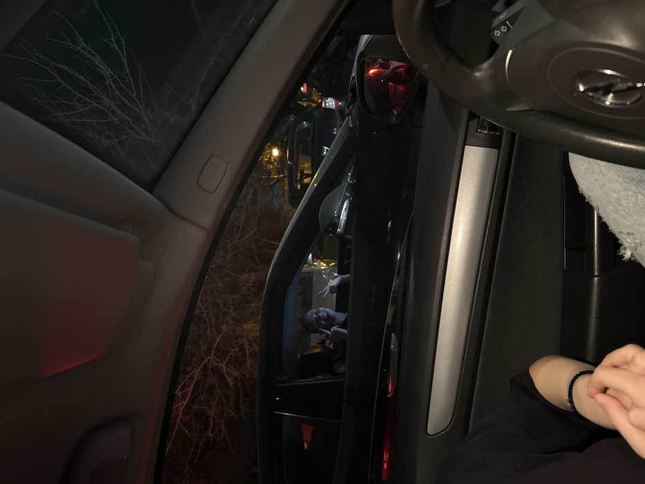 The image captures a nighttime scene in Plovdiv, Bulgaria, from the interior of a vehicle. The observer's car shows a dark steering wheel on the right, a door panel with a horizontal silver trim accent, and the arm and clasped hands of a person in a dark top with a dark bracelet on the left. A leg in light-colored, ripped jeans is partially visible towards the lower right. Outside, a dark-colored sedan or SUV is positioned parallel to the observer's vehicle. A young individual with short hair, seated in the driver's seat of the adjacent car, smiles broadly while looking towards the observer. This individual performs two hand gestures: a V-sign with their right hand and an extended middle finger with their left hand. The adjacent car's side mirror is visible. The background reveals bare tree branches silhouetted against the dark night sky, with indistinct streetlights and vehicle lights providing ambient illumination.