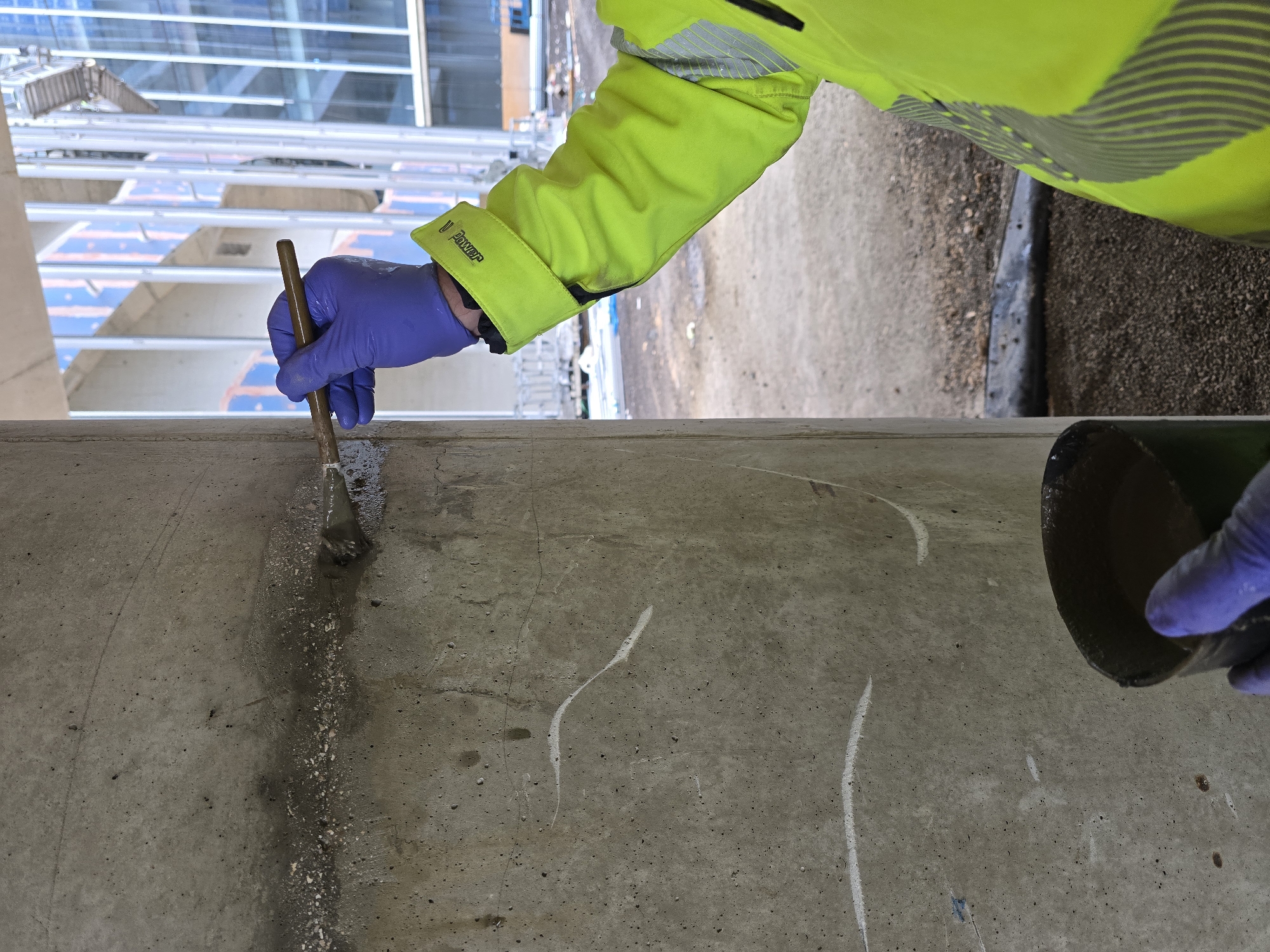 A person wearing a fluorescent yellow jacket and blue gloves is applying a dark substance to a concrete surface with a small brush