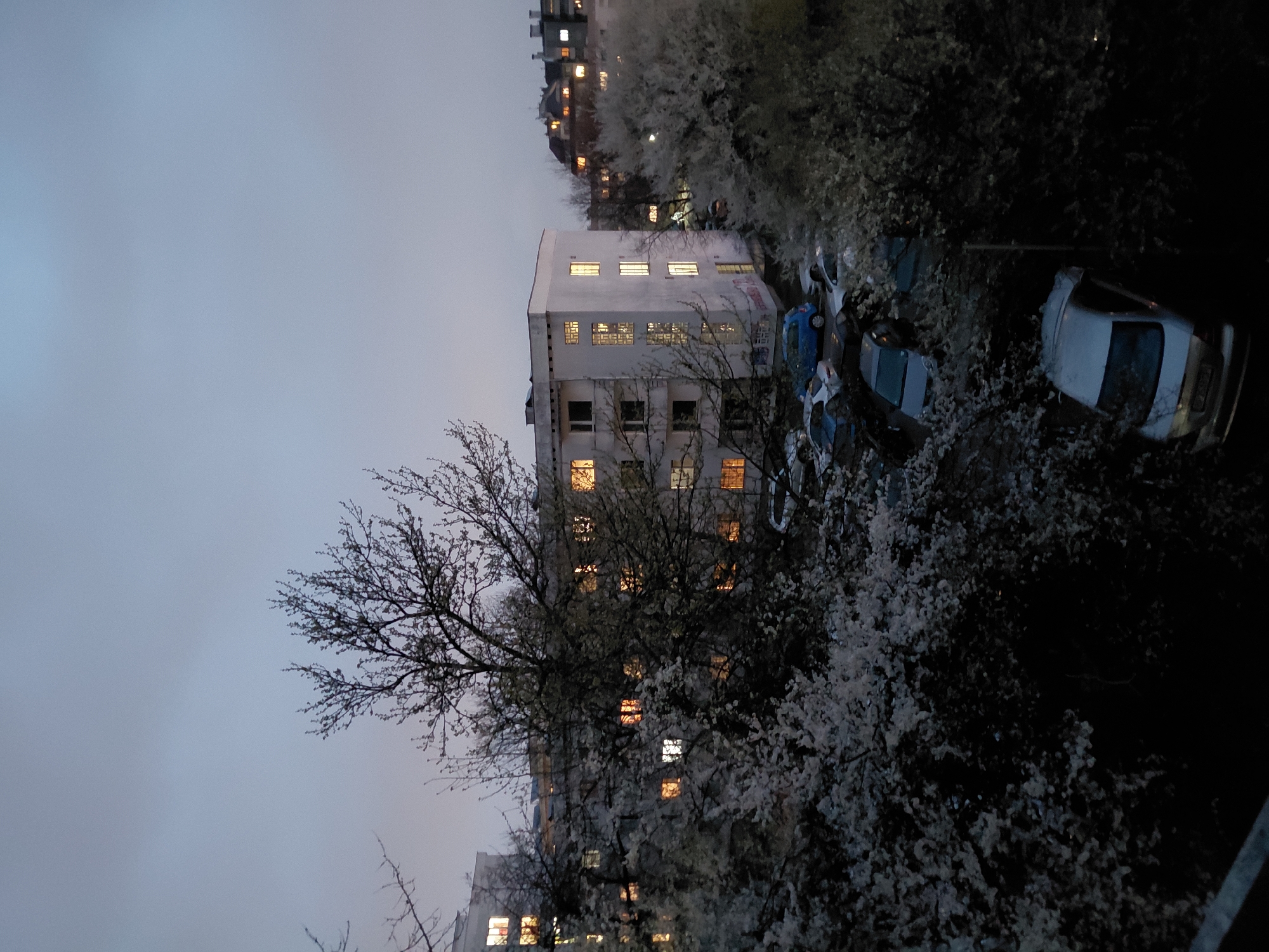 The image depicts a building illuminated at night, likely an apartment complex in Sofia, Bulgaria. The building is white with multiple visible windows glowing from interior lights. In the foreground, a bare tree and blossoming branches obscure part of the view. Several parked cars are visible adjacent to the building, and other buildings with lighted windows are faintly seen in the background. The sky is overcast. The scene suggests an urban environment at dusk or early evening.