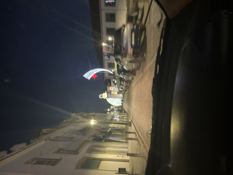 The photo shows a street at night, viewed from inside a vehicle. Buildings line the street with glowing windows and street lamps. Festive holiday decorations, including a lighted arc and an ornament shape, adorn the thoroughfare. Cars are parked along the side of the road. The night sky is visible above the buildings. The vehicle's interior is dark, with parts of the dashboard visible.