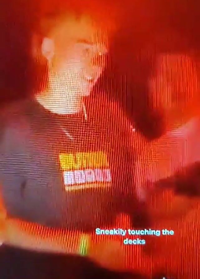 DJ subtly adjusting the sound deck at a party, with red lighting creating an intense atmosphere. The video's captions imply the DJ may be attempting to trick the other person at the deck. There are other people in the background, including one wearing a t-shirt, also near the deck. The video zooms in on the face of the DJ, with some confusion and suspicion from the person filming the video.