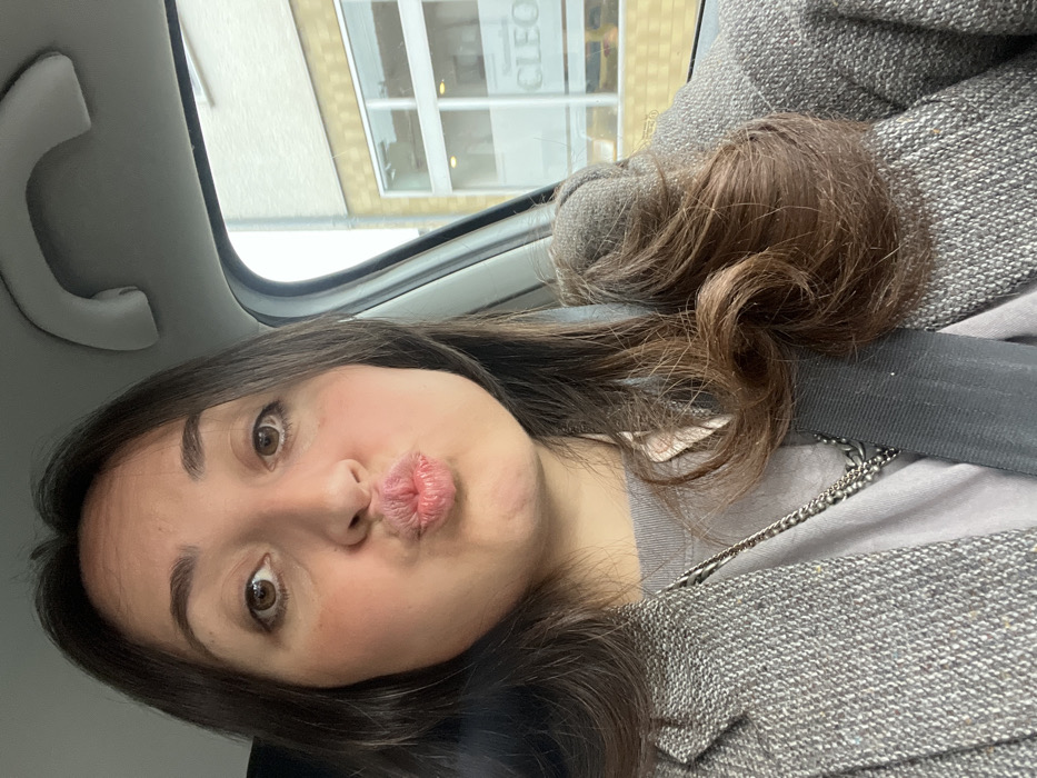 A female individual is depicted in a selfie, seated inside a vehicle