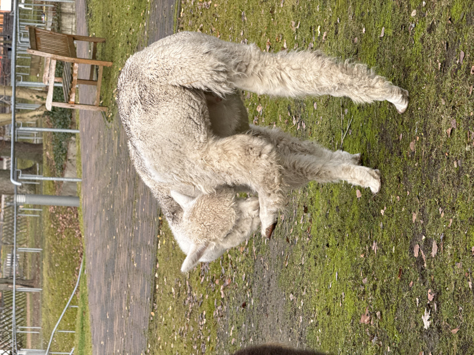 The image displays an alpaca within an outdoor enclosure, likely located in the Tierpark Berlin, Germany
