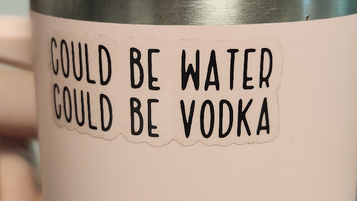 - "A pale pink cup displays a sticker that reads, "COULD BE WATER COULD BE VODKA" by FM-zw5Y13, licensed under CC BY 4.0