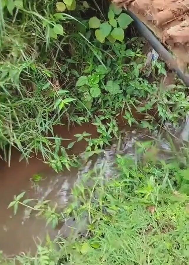 small, shallow stream flowing under a rudimentary wooden bridge made of logs. The water appears slightly murky, with a brownish tint. Green vegetation, including grass and leafy plants, surrounds the stream and the bridge. A black pipe runs alongside the bridge. The bridge itself seems to be constructed from roughly hewn logs laid side by side. The overall environment suggests a natural, possibly rural setting.