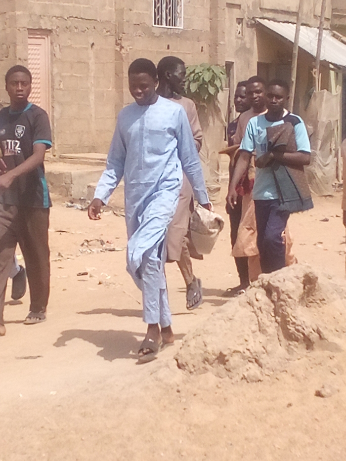 The scene depicts a group of approximately six to seven males walking on an unpaved, sandy street in Rangaza, Nigeria, under bright daylight conditions