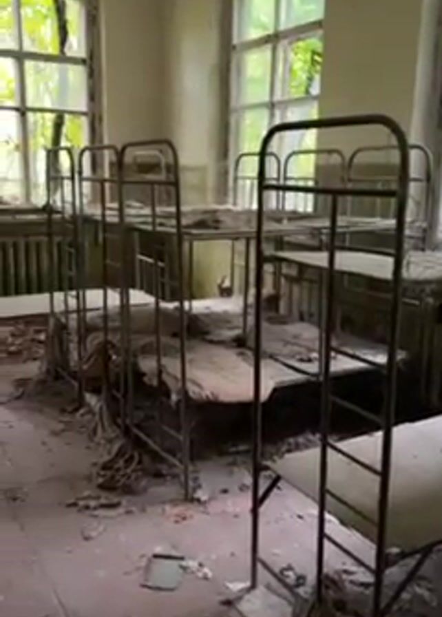 interior of an abandoned room filled with bunk beds. The room is decaying, with chipped paint and debris scattered across the floor. There are several metal-framed bunk beds, some with tattered remains of bedding. Daylight filters through the windows, revealing a view of green foliage outside. A doll lies on one of the beds amidst the debris. The camera slowly pans across the room, capturing the dilapidated state of the space.