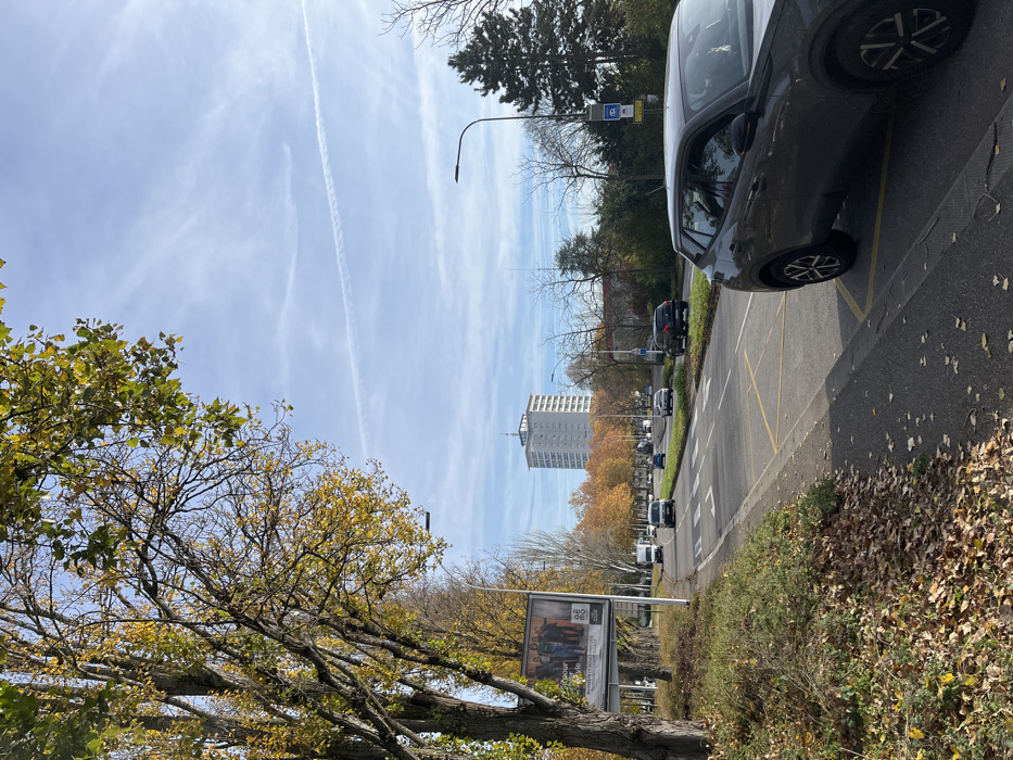 This image depicts an urban street scene in Schiltigheim, France, on an autumn day under a clear blue sky featuring scattered clouds and a prominent aircraft contrail. In the immediate foreground, a dark grey SUV is parked curbside on the right, with its front right wheel and side visible, positioned within a yellow-marked restriction zone on the pavement. To the left, a dense line of tall deciduous trees displays a mix of yellow and green autumn foliage, with numerous fallen leaves scattered across the grassy verge below. Further along this treeline, a large billboard features an advertisement for "GEMO," depicting several individuals. The central feature is a two-lane asphalt road, receding into the distance, with moderate vehicle traffic. Multiple cars and a white van are visible driving away from the viewer. Along the right side of the road, a streetlight pole with attached road signs, including a blue bus stop symbol, stands. In the background, a tall, white, multi-story building, identifiable as a high-rise, dominates the skyline, positioned above the distant road. No specific individuals are clearly discernible.