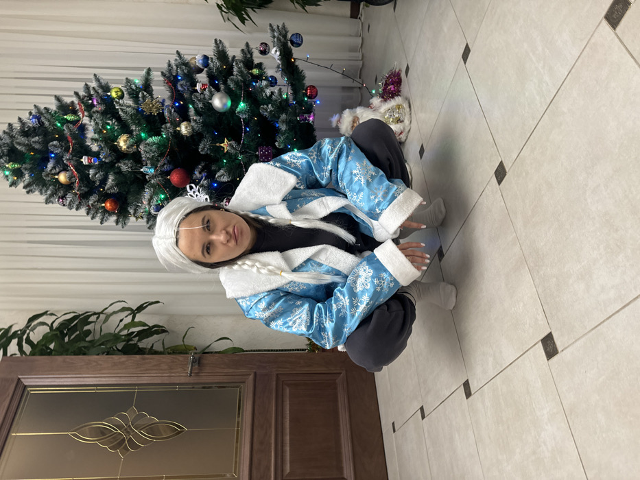 An indoor photograph taken in Vysokinichi, Russia, depicts a female subject squatting on a tiled floor. The woman wears a light blue jacket adorned with silver snowflake patterns and white faux fur trim, a dark undershirt, dark trousers, and white socks. She has a white wig styled with two long braids secured by yellow bands, with a loose strand across her forehead. Her face is directed towards the camera with a pouting expression, characterized by downturned lips. Her hands rest on her knees. To the subject's left is a dark wooden door featuring an ornate glass panel with a swirling design and a metallic handle. Behind the door, a tall green houseplant is partially visible. To the subject's right and in the background, a fully decorated artificial Christmas tree stands, adorned with multicolored string lights and various ornaments. Behind the tree are white translucent curtains. On the floor near the base of the Christmas tree are a small white decorative Santa Claus figure and a quantity of pink and silver tinsel. The floor is composed of large, light-colored square tiles with darker, decorative square inserts at their intersections.