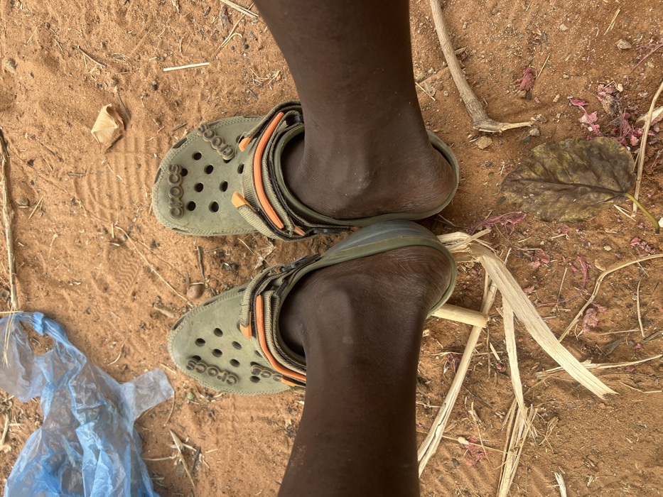 A top-down, close-up forensic view depicts the lower legs and feet of an individual with dark skin, wearing two olive green Crocs sandals with visible orange adjustable straps and "Crocs" branding on the upper surfaces. The feet are positioned on reddish-brown sandy soil characteristic of outdoor terrain in Birnin Kebbi, Nigeria. Scattered debris on the ground includes a crumpled light blue plastic bag in the upper left, various dry plant fragments and twigs, a prominent dried brown leaf, and small reddish floral debris. No active interactions are observed; the individual's feet are stationary.
