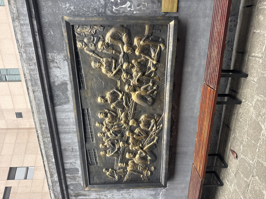An elongated, dark bronze relief sculpture is mounted on a gray stone wall. The relief depicts numerous figures in various poses, some with tools or weapons, climbing or working together. A wooden bench with metal supports runs alongside the sculpture. The surrounding wall is weathered and textured. A modern building is visible in the background.