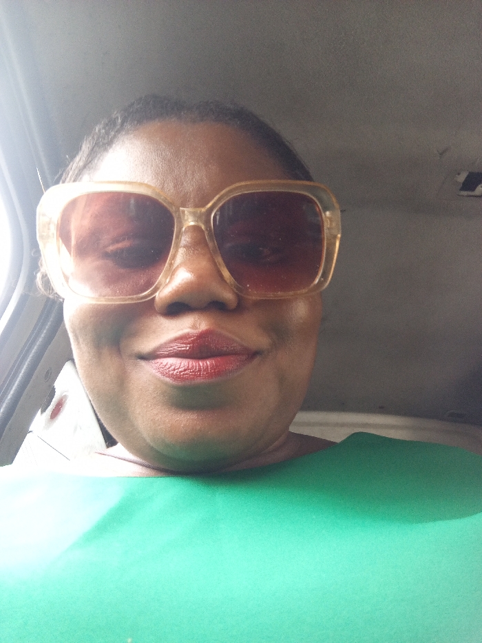 A close-up image features an adult female with dark skin, seated inside a vehicle in the city of Unknown, Unknown