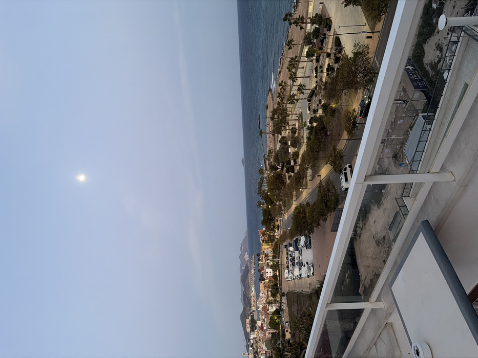 An elevated, wide-angle nocturnal scene depicts the coastal city of Villajoyosa/la Vila Joiosa, Spain, under a pale blue-grey sky. A bright, full or near-full moon is visible in the upper center of the sky. In the immediate foreground, a white balcony railing with clear glass panels spans the width of the frame. A corner of a light-colored, rectangular table is partially visible on the lower left, featuring a white ashtray. Below the balcony, the landscape transitions to the city's infrastructure. To the left, a residential area of Villajoyosa/la Vila Joiosa is visible, characterized by numerous multi-colored buildings with terracotta roofs ascending a hillside. Distant hills and structures, including what appear to be elevated roadways or bridges, extend along the coastline in the far background. Directly below the residential area, an unpaved parking lot contains approximately 20 to 30 parked vehicles of various models and colors. A paved road, illuminated by streetlights, runs parallel to the coastline. A white van is observed traveling in the left lane, and a dark-colored car with illuminated headlights proceeds further down the road. Between the road and the sea, a landscaped strip features numerous palm trees and other trees with sparse foliage, interspersed with streetlights and pedestrian pathways. The Mediterranean Sea occupies the right half of the image, appearing dark blue with visible white-capped waves breaking near the shoreline. A small, dark, rocky islet is situated offshore in the upper right portion of the sea. The distant coastline recedes into the hazy horizon. No individuals are visible in the scene.