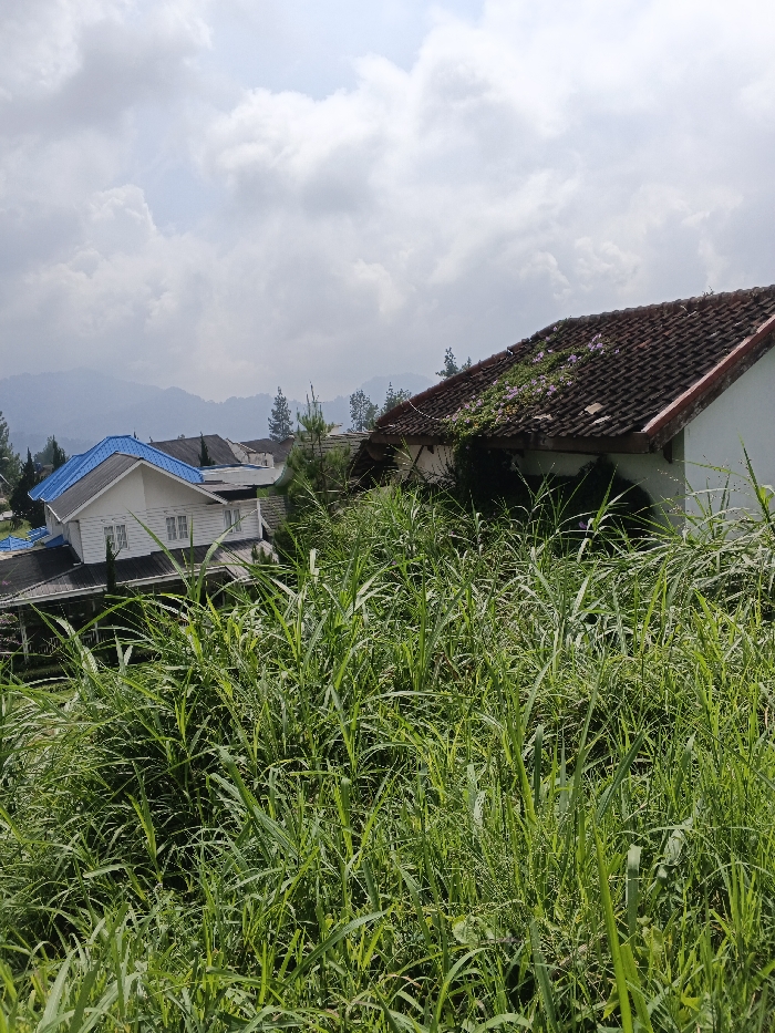 A high-angle view showcases overgrown green grasses in the foreground. In the background, a couple of houses are partially visible. One has a blue roof and white walls; the other features a reddish-brown tiled roof with some vine growth. Further back, a slightly out-of-focus mountain range stretches across the horizon under a cloudy sky.