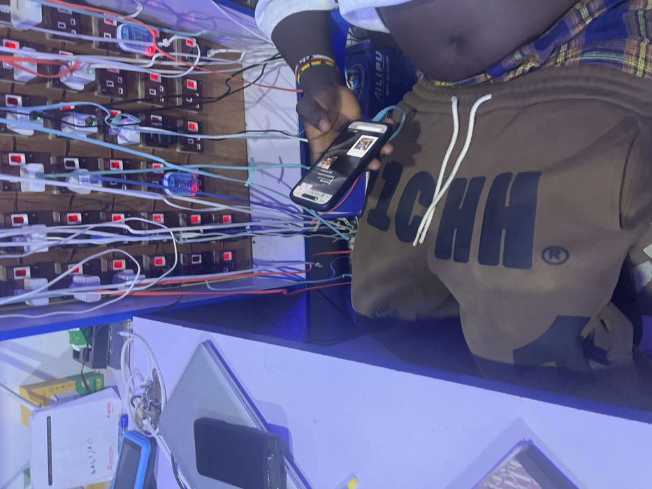 The image depicts an indoor scene in Ikot Ekpene, Nigeria, characterized by an extensive ad-hoc charging station