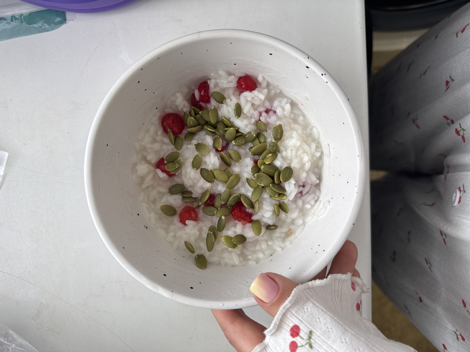 - "A top-down shot depicts a person holding a white speckled bowl filled with rice porridge topped with pumpkin seeds and red berries" by FM-0B3mJ3, licensed under CC BY 4.0