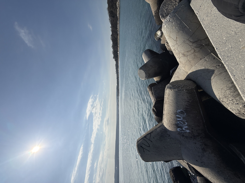 The image displays a daytime coastal scene in Varna, Bulgaria. In the foreground and midground, a prominent arrangement of weathered, grey concrete tetrapod breakwater units lines the edge of the water. Graffiti is visible on two of these units: "1UP" (or "ЮР") on the top surface of one unit, and "ВЕМО" spray-painted in white on the side of another. The calm, blue-green water, likely the Black Sea, extends across the frame, reflecting sunlight. A distant, low-lying landmass forms the horizon. To the right, a tree-lined coastline, consistent with Varna's Sea Garden, is visible, featuring faint distant structures. The sky is clear and light blue with sparse white cirrus clouds. The sun, a bright light source, is positioned in the upper left quadrant of the frame. A flat, grey concrete surface, suggesting a pier or promenade, is visible in the bottom right corner. No human figures or discernible actions are depicted.