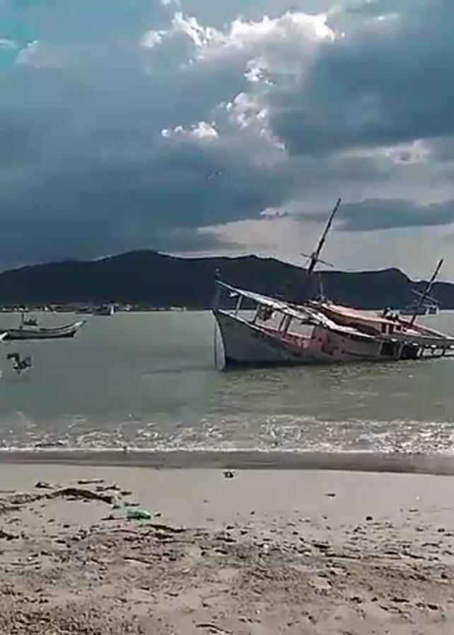 beach scene under a cloudy sky. Several boats are anchored in the water, including a larger, derelict sailboat listing heavily to one side. Seagulls are visible near the shore and on some of the boats. The beach is sandy, with some debris scattered about. In the background, mountains can be seen.