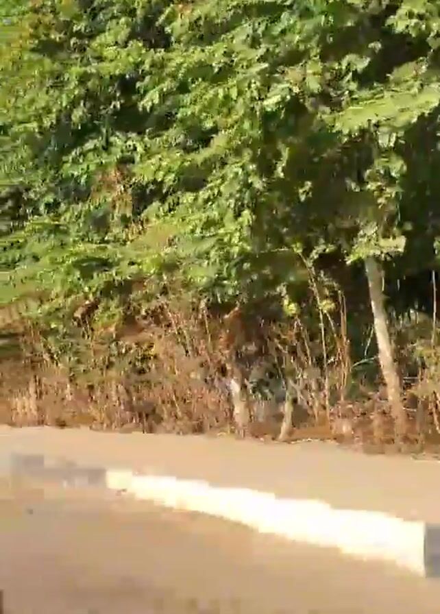 roadside view from a moving vehicle, likely an auto-rickshaw due to the visible frame and yellow paint. Lush green trees and dry underbrush border a paved road with a white concrete curb. The sky is clear and blue. Other vehicles appear in the distance.