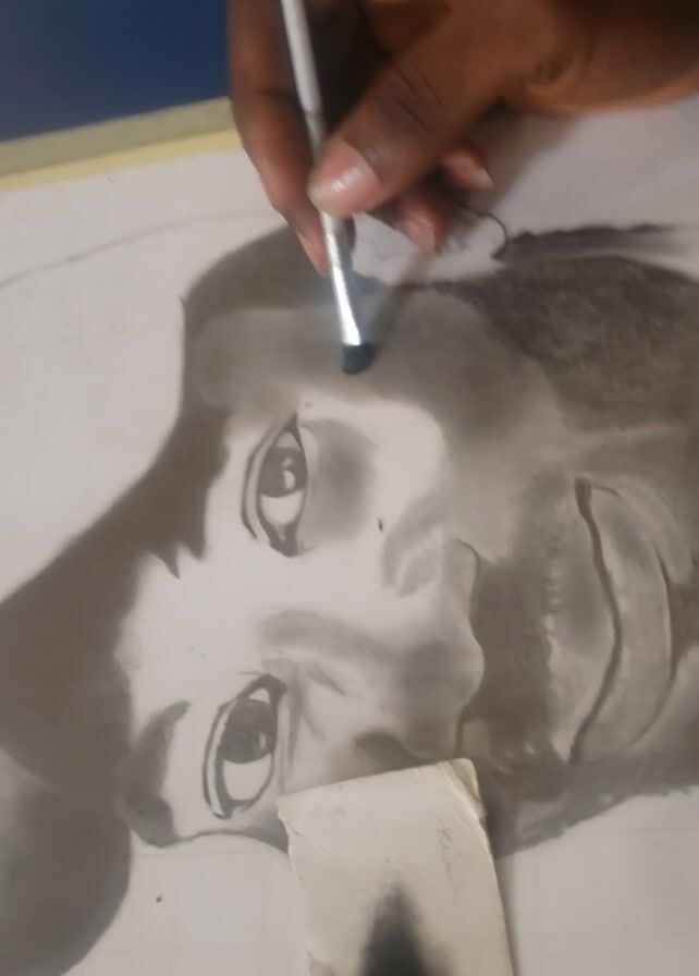 close-up of a hand holding a fine-tipped paintbrush and applying shading to a charcoal drawing of a Black man's face