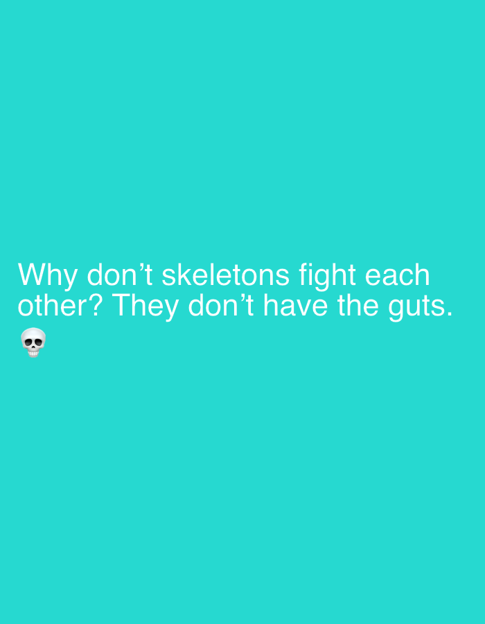 The image is a cyan background with white text in the center that reads, "Why don't skeletons fight each other? They don't have the guts