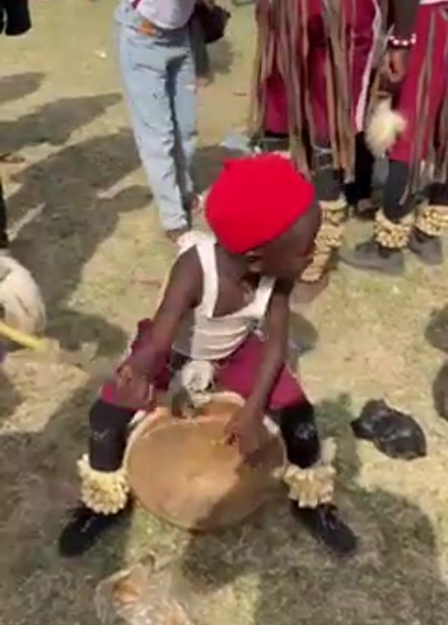 A young child is sitting on the ground playing a drum with a stick. The child is wearing a red hat, white tank top, and maroon pants. There are tasselled decorations attached to the child's lower legs. The drum is circular and made of brown material. Several adults stand around the child, some in traditional clothing and some in modern clothing. The scene takes place on a grassy area outdoors. People are dancing.