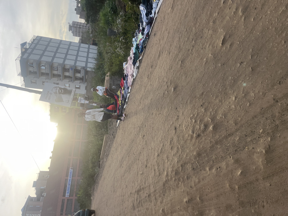 A street scene depicts a clothing market laid out along a dirt road. Garments in various colors are spread across a surface. People are browsing the merchandise. Buildings, including a tall structure, line the background. A billboard is visible, and the sun shines brightly, creating glare in the image. The road's surface is rough and uneven.