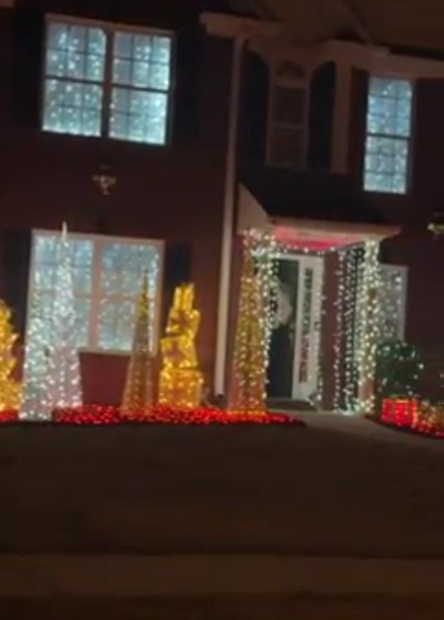 two-story brick house decorated for Christmas at night. The windows on the front of the house are covered in white lights. In the front yard, there are lighted Christmas trees in white and gold, outlined with red lights. There are also lighted Christmas presents in red and gold along the base of the house. The front door is decorated with a string of white lights and a wreath. There is a car parked in the driveway.